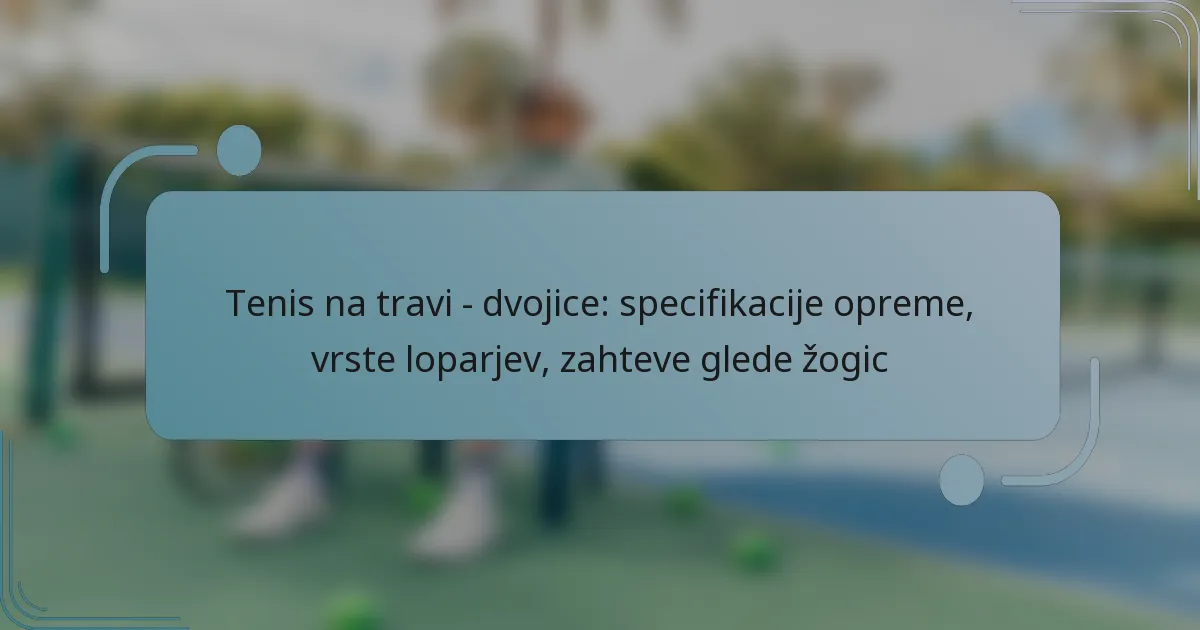 Specifikacije opreme za tenis na travi v dvojicah vključujejo specifične dimenzije igrišča, višino mreže ter priporočene vrste loparjev in žogic. Razumevanje teh elementov je ključno za optimalno delovanje in spoštovanje tekmovalnih pravil.